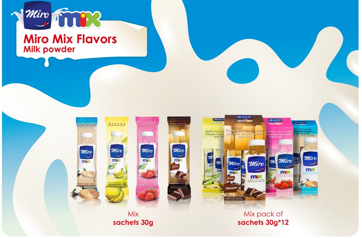 ميرو ميكس 4*1 (2 ظرف فراولة+ 2 ظرف موز + 2 ظرف شيكولاتة + 2 ظرف فانيليا بالبسكوت)